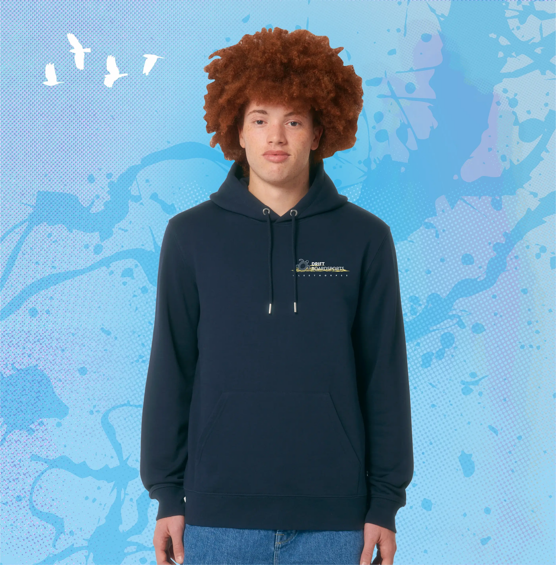 Person wearing a navy Drift Boardsports Cleethorpes hoodie with a graphic design on the back against a blue abstract background.